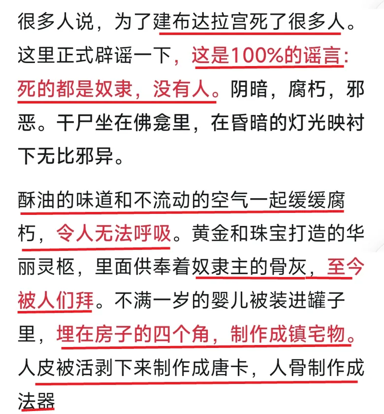 来源:今日头条网友 大家好!我是不知茗。在阅读此文之前,辛苦您点击一下“关注”,既方便您进行讨论和分享,又能每天给您带来新鲜有趣的见闻分享,感谢您对不知名的支持!谢谢! 文丨不知茗的我 编辑丨不知茗的我 今日话题:布达拉宫到底有多么震撼? 布达拉宫是位于中国西藏拉萨的宫堡式建筑群,海拔3700米。始建于公元631年,由吐蕃首领松赞干布为迎娶唐朝文成公主而建,现为世界文化遗产。 那么,布达拉宫到底有多震撼呢? 此话题也是引起了网友们的热议,看完网友的分享,太恐怖了! 血肉堆砌的布达拉宫,上位者却多得以善终,藏传更近于魔,与佛无关,所以我就不明白了,去那里洗个毛的心灵啊![]() ![]() 这就是一个人间炼狱呀,那些上位者如何睡得着的!