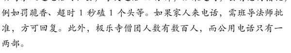 在极乐寺有熟悉的同学,她们是可以交流的物件,但是大多数同学都没有手机,也不能上网,难以联系上。唯一有效的联系管道是打电话到寺里客堂,请客堂帮找同学接听电话,我想过这个办法,但又马上否定了,因为担心这麽做会引起客堂负责法师的猜疑,不仅不会帮我叫来同学,还极可能上报给贤Bo,最终会给我自己和同学都带来麻烦。即便是能够联系上同学,像这样涉及对师父怀疑和否定的“冒天下之大不韪”的事情,也不知道人家是否愿意听我说。
