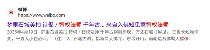 大佛寺歷史悠久,是旅遊勝地,再過二三十年就有兩千年的歷史了。 佛門寺院本來應該是這個世界上最神聖、最清淨、最能給人安隱的歸依處。 在如此莊嚴的大佛前, 不知道自己的心心念念、所作所為, 諸佛和大菩薩都了然於心嗎? 夢裡石城美拍 ——釋智權 千年古刹刹那現, 萬丈石城寸屏見; 三世長短唯識變, 十方大小在心間。 ![]() 因原舉報者發文已經被全面刪除,故附以截屏。 |