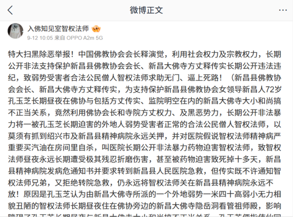 特大掃黑除惡舉報!中國佛教協會會長釋**,利用社會權力及宗教權力,長期公開非法支持保護新昌縣佛教協會會長、新昌大佛寺方丈釋傳實長期公開違法違紀,致弱勢受害者合法公民僧人智權法師求助無門、逼上死路!(新昌縣佛教協會會長、新昌大佛寺方丈釋傳實,為支持保護新昌縣佛教協會女領導新昌人72歲孔玉芝長期晝夜在佛協與包括方丈傳實、監院明空在內的新昌大佛寺大小和尚搞不正當關係,竟然利用佛協會長和寺院方丈權力、及黑惡勢力,長期公開非法暴力將一被孔玉芝長期迫害的外地人弱勢受害者正常的合法公民僧人智權法師,以莫須有抓到紹興市及新昌縣精神病院永遠關押,並對醫院假說智權法師精神病嚴重要買汽油在房間裡自殺,叫醫院長期公開非法暴力藥物迫害智權法師,致智權法師晝夜永遠長期遭受極其殘忍折磨傷害,甚至被藥物迫害致死掉十多天,新昌縣精神病院發病危通知書並要求轉到新昌縣人民醫院急救,但傳實既不許通知智權法師兄弟,又拒絕轉院急救,仍永遠將智權法師關在新昌縣精神病院永遠不放!原因是孔玉芝認為由新昌大佛寺所派的一個外地弱勢一米四十高弱小無力相貌醜陋的智權法師長期晝夜住在佛協旁邊的新昌大佛寺隱岳洞看管祖師殿,影響障礙了孔玉芝長期晝夜與新昌大佛寺大小和尚搞不正當關係,孔玉芝便指使夥同他人及兒女長期晝夜來隱嶽洞辱駡毆打驅趕智權法師! https://m.weibo.cn/status/5209993582216966