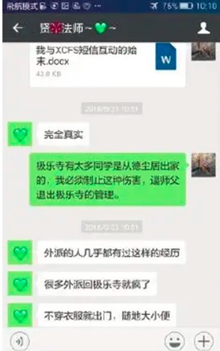 日後,那份在網上流傳的“95頁PDF”舉報師父的材料裡,收錄了我寫我收到師父短信騷擾的經過一文,我在文章中說我在12月27日第一次收到師父發來的短信,這被一些人引用來為師父開脫,說師父這一天在參加荼毗儀式呢,怎麼可能有功夫發騷擾短信?事實是這樣的:師父這一天給我們發送短信的時間點,都不是在荼毗儀式的期間,而是在之前或之後,這和他參加荼毗儀式是不衝突的。再說,就算是在荼毗儀式的過程中,怎麼就不能發短信呢?只要他想發,隨時有時間空檔都可以發。要知道,師父有一項被弟子們廣為讚頌的過人能力,就是能夠“在不同的事情之間迅速地切換狀態”。後來大家看到的短信記錄表明,師父就是有在一邊接待客人的時候,一邊給弟子安排工作,還一邊給我發了騷擾短信。另外,我的文章中沒有說師父第一次發來的短信就是騷擾短信。師父不是一上來就騷擾,如果是這樣的話,我勢必立馬認定對方是個壞蛋,早就果斷拉入黑名單,也不可能再有後續的交流
