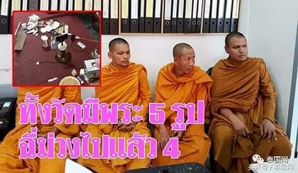 2017年2月26日凌晨 泰国班武里警方接到群众报案称,一辆车停在离kuiburi医院相邻的深巷里,由於停车时间较长,加上该区域为幽暗偏僻区域,时常发生抢劫犯罪事件,希望警察能前去调查。警方赶到现场调查结果令人吃惊,车内是1名僧侣及1名47岁女子。 2017年3月8日 泰国北柳府警方逮捕了8名僧侣,他们每日向民众化缘只收钱财,其他食物及日常用品一概不要,并将骗来的钱财用於购买酒水及毒品,并涉嫌到赌场赌钱。