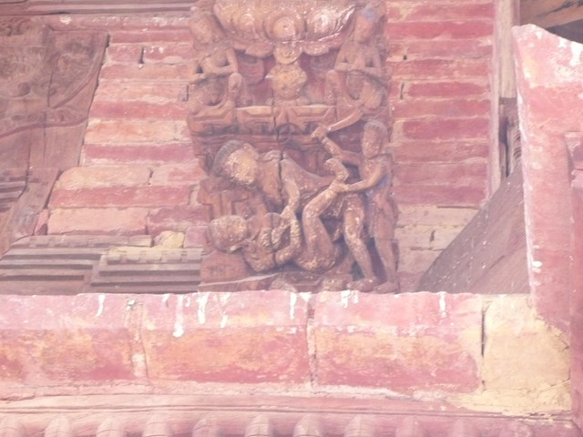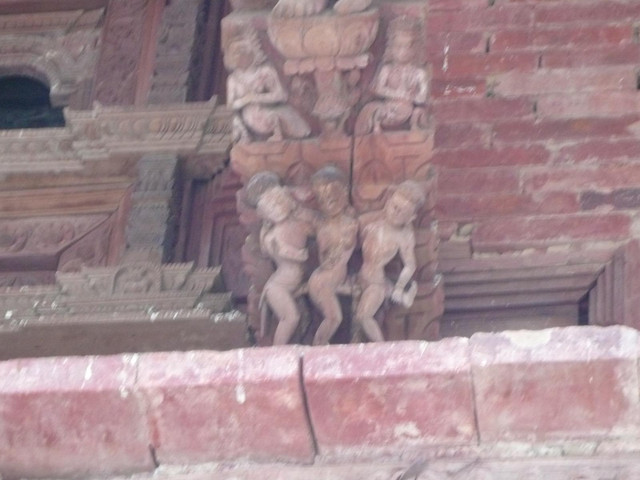終於,走到帕坦文化的最精華區….杜巴廣場(皇宮廣場)。因為貪照相片,到達廣場時,導遊的開場白已開鑼一段時間了。 未聽清楚他介紹廟名,只見他站在雨裡,背對著皇家博物館,指著廟宇的飛簷說:『因為印度教的雷神是個處女,尼泊爾的廟群建築裡,多會有建有這種性愛雕像的廟宇,好讓女神看見他們,覺得羞慚,避之唯恐不及,忘了雷劈,避免火災的發生,…..。』 想起在機場的明信片,覺得這種獨樹一幟的防火措施,除了叫我錯愕,更叫我好奇。於是秉持著打破沙鍋問到底的精神,開始向導遊請教。可惜瑞狄仗著國語不好的優勢,只紅著臉,支支吾吾地說: 『尼國人結婚前,父母都會帶孩子到這裡,看性愛木雕,接受婚前的性教育。而且在印度教裡,是有這種性愛瑜珈修練的。』 看著瑞狄倉惶逃走,不忍追問這個老實人,撐著傘,一邊照相,一邊打量起這間不細看,一點也不起眼的性廟。