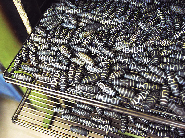 台 灣業者透露,因為工資考量,瑪瑙染色加工都在中國大陸處理,本刊前往中國最大的瑪瑙加工地—廈門東孚鎮發現,許多天珠瑪瑙製品,都是在此加工染色再銷回台 灣。瑪瑙村內約五公里的街上,戶戶都是瑪瑙工廠,從裁切、烘烤到染色都有,是瑪瑙飾品重要的集散地,張老闆說:「製造天珠的紅黑玉髓,都是由巴西、烏拉圭 的白瑪瑙染成的,先打磨、刨光,然後浸泡硝酸後用清水洗淨,再一次烘烤,就浸泡在紅、黑、綠不同顏料桶內,幾小時就完工了,每個成本只要人民幣幾毛錢。」 悅康與山喜房紛紛打著西藏原礦作為號召,以抬高產品售價,製造商小盧寶石公司老闆盧有德說:「天珠的原料大都來自中南美洲,我去過西藏很多次,也看了當地 的瑪瑙礦石,質地很差,根本沒有加工價值。」