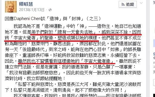 慈濟內部的「造神」,終於在有網友正式披露! 完整且負責任的提供了雕像照片、雜誌等圖文紀錄之後,受到媒體更多也更直接的重視。 我有必要,補充一些「佛教經典、佛教美學、佛教領域」的背景信息,幫助思考這個必然引起廣大喧騰的新聞。 我認為,這一尊塑像,將是真正衝擊慈濟從過去「佛教團體」的訴求,如今證明早已「扭曲擴張」到「連佛的地位都可以竊取」的一大轉捩點! 這與慈善環保的社會行為無關,卻可以真正解釋並洞悉,慈濟為何後來會變成「資本掠奪」的可怕團體! 過去明明樸實低調的證嚴法師,為何如今可以自己睜著大眼,毫無遲疑或不適的站在自己的壁畫之前與雕像之後,接受萬名慈濟信眾跪拜叩首! . 事實上,佛教的雕像與壁畫,本身都有規範。 佛教的塑像與個人發揮的藝術作品不同,古今中外也都考量到「集體審美」的需求與思考,不會、也不敢輕易混淆。 因為事實上,佛教經典本身,始終就規範有一部「佛說造像量度經」!! 當中對於佛像,總共有哪些「圓滿功德」的特徵、身形比例不同於常人的原因,乃至姿態、手勢、神情的特殊表現,都有明確的規範。 最關鍵的是,這是經典中「佛自己說的」! 緣起於有弟子詢問佛陀,今後若佛不在世、情感與修行上想念憶念,因此希望塑像瞻仰,該怎麼做?於是佛陀提出了「怎麼雕塑他的樣子」。 因此,正規的佛像不是藝術品,該怎麼塑,也不是慈濟片面或證嚴法師自己能「說了算」! . 慈濟這尊、乃至這些引發驚人熱議的「證嚴佛像」,在佛教圈早就被批判多年。 只是礙於慈濟勢力龐大,像我這般肯公開大膽批判的討厭鬼太少。 一如慈濟的資本擴張爭議,只是外界並不知情而已。 對於佛教教義精神的扭曲,這也是我之前從佛教角度,多次批判慈濟的重要觀點依據之一! . 佛經中明列佛陀的稱呼,有「十號」。包括「如來、應供、正遍知、明行足、善逝、世間解、無上士、調御丈夫、天人師、佛、世尊」。 經典中並且載明,這十種稱號,是諸佛覺悟智慧、饒益眾生,與功德圓滿的內涵表徵,是「十方三世古今未來所共通,不會有所改變」!因此,真正的佛弟子,有哪麼多名號可以選,也不會也不必再「另創名號」。 然而,慈濟從最初稱呼證嚴「法師」到改成了「上人」,這當然可以是內部的尊稱。 但後來那個「扭曲變形」的關鍵來了! 慈濟內部進一步狸貓換太子,將純粹完整的「佛陀」稱呼,後來改稱全世界只有慈濟稱呼的「宇宙大覺者」?! 而除了佛陀的「名稱」被正式竊取了,又同時在塑像與雕像上繼續大動手腳,全然改成「證嚴法師的相貌」。 . . 這一切動作,誠然也是我所批判的,在慈善募款海內外甚至中國大陸到處購地買樓之外,屬於佛教教義與精神價值方面,最嚴重「扭曲、竊取、擴張」的關鍵! 這些「慈濟證嚴版佛像」,不只售價昂貴,明顯可以輕易在團體內部獲得上百億的金錢!(只要賣出三萬尊,就有一百億!應該查一下交易總額與稅務吧!),更可怕也令人嘔心的訴求,這是「讓慈濟人買回去改當佛像供養」的全新宇宙大覺者! 和慈濟後來的扭曲風格一致:以慈善之名「掠奪你的錢」,還要以佛之名「永遠掠奪你的心」!透過「信仰」,實質上全然是「金錢與精神」的多重掠奪! 而這些各種巧立名目的展現,最讓人難以想像的,是「證嚴法師完全看在眼底」!並且雕塑畫像的原始設計都經她「點頭同意」! 甚至她自己在所有慈濟的活動上,站在自己的壁畫與雕像之前,接受所有慈濟人的跪拜供養。 若從一般佛教界人士所熟知的角度,嚴格來說,慈濟與證嚴法師,其實後來路線發展與民間爭議甚大的那位「清海無上師」的「無上師」路線全然無異! 清海,向來也在全球推廣素食不遺餘力。但清海可能比證嚴還稍微「客氣一些」,清海無上師畢竟只敢宣稱她是觀音菩薩的化身,還不敢搶佛陀的地位,自稱什麼毫無經典依據、亂七八糟的「宇宙大覺者」就是。 . . 佛教的佛陀造像,無論大乘小乘、藏傳漢傳日本體系都不盡相同。 但無論是佛陀金碧輝煌的「圓滿相」,或者餓到瘦弱肋骨浮出的「苦行相」,請記得:「都有經典上的規範和依據」! 全然不是慈濟一個團體,或者證嚴一位比丘尼,可以簡單說上幾句:「(證嚴說:)傳統的佛像都是胖胖的,但是為了弘法到處奔走,怎麼會胖胖的呢?」可以扭曲替換。 請注意,那不是「胖胖的」!也從來沒有任何出家人會嫌自己的佛陀,是「胖胖的」! 那是一種對於所謂「功德圓滿」的造像表徵,是相對於印度階層或娑婆世界苦難貧困之外,一種透過塑像表達圓滿於智慧福德的嚮往與景仰。 這也是全世界所有古印度、西藏、敦煌、中國、東南亞、日本,乃至全世界任何佛教國家所共同傳承的「佛陀造像」的理論與實務,在各種佛教美學乃至敦煌壁畫研究的共通思路! 特別是即使見仁見智可以有不同的藝術手法表現,也仍然還有「佛說造像量度經」的規範。 古今中外所有「正信佛教」無論寺院道場或民間團體,乃至雕刻、雕塑佛像的工藝人士,也都會完整參考甚讀誦這部經典。 . 這樣的一尊「證嚴版宇宙大覺者」,非要強說是「佛陀像」無異,這不是佛教經典與精神上的「扭曲」,那是什麼? 慈濟如今整個裡裡外外各種「扭曲、擴張」的蟲子多如牛毛!但這算是第一次浮上檯面,慈濟涉及於佛教思想、實務與體系方面的長久爭議。 任何「扭曲、竊取、擴張」,均非一日一夜所致。特別是「