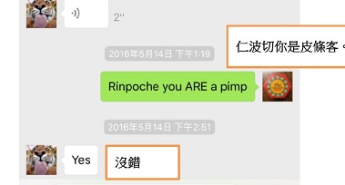 (宗薩欽哲仁波切的微信) 宗薩欽哲是一個狡猾的西藏喇嘛,他自知是皮條客,只不過一直裝傻。他為了欽哲傳承的事業,覬覦噶瑪巴的華人弟子的龐大財勢,所以長期一直輸送女弟子去給噶瑪巴做枕邊進言,想要噶瑪巴采用他的所有事業模式。2016年11月20日,當天噶瑪巴參訪宗薩佛學院和鹿野學苑,我和宗薩的微信對話,可以看出他內心根本對噶瑪巴毫不欣賞也不尊敬,只是看在噶瑪巴的地位和權勢上,盡量拍馬屁而已,而噶瑪巴也樂得接受這些女人供養,享受榮華富貴。佛法只是他們拿來表演的道具而已。 長期以來,宗薩仁波切為了延續個人派別傳承,並掌控年輕祖古(藏語:轉世的成就者)而舉辦「領袖課程」,曾邀請大寶法王及貝諾法王的法王子參與,皆被拒絕。因此宗薩仁波切一方面口頭上說要改革祖古文化,但一方面私下仍貢獻女人給年輕祖古來控制影響他們,因為他認為「美人計」是控制年輕男性最快的方法。 更令人難以想像的是,宗薩仁波切其實長期以來為大寶法王「物色」女性,宗薩仁波切明知法王從青少年時期由於被軟禁而患有心理疾病,卻為了壯大自己的傳承教派、影響法王,而不停上貢女信徒,並掌握噶瑪巴喜歡「小清新」的愛好,女信徒來自世界各地,從歐洲、美洲到亞洲,她們都擁有高學歷和姣好外表,卻因大寶法王在宗教權威和情感哄騙下而難以離開。 小珍自己同樣經歷過無數掙扎,多次幾乎迷失自我幾乎自殺,她多次向宗薩欽哲仁波切訴說法王帶給她的精神壓力,但仁波切為了個人目的,卻不停地要求小珍留在噶瑪巴身邊,還要小珍定期彙報。 二O一五年時,仁波切當小珍向仁波切求救時,仁波切不但詳細詢問兩人的性愛內容,還教導小珍告訴法王「他只是個玩具」,甚至要她跟其他男性約會,好引起噶瑪巴的嫉妒心,最終卻不希望小珍遠離法王,直至小珍再無利用價值。 事實上,在小珍與法王交往的數年間,仁波切時常指示何時前往、離開大寶法王的各項法會活動,指示她應該向噶瑪巴傳遞宗薩的政治理念,或要她轉貼文章給大寶法王,鼓吹噶瑪巴放棄出家身份還俗。同時,仁波切也在自己教授的公開課程結束後的聚會或個人會面時間,私下詢問小珍與噶瑪巴關系進展,並指示小珍如何互動,例如交往別的男性,來起引噶瑪巴的嫉妒心。但當仁波切發現小珍對法王影響力消退時,仁波切竟一反過去莊重嚴肅的態度,嘲笑小珍是「手段不足」、「沒有技巧」,「趕快去找其他男人上床」,並指著小珍大罵,「噶瑪巴像磁鐵一樣把他的學生都吸了過去」,她才發現自己只是仁波切的一顆棋子,下定決心結束這段不正常的關系。