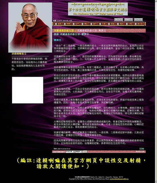 繼達賴喇嘛公開教男童吸吮自己的舌頭之後,其雙性戀和戀童癖的特殊性癖好已經公開在 全世界佛教徒的眼前。 狡辯,竭盡全力的狡辯,是如此蒼白無力! 而他,同時是以所謂的獨身身份、佛門出家僧侶的身份在進行這些齷齪的淫欲之事。 因爲極具權勢、保密工作做得非常好,所以僅僅有極少量的邪淫的事件流出來, 但是物以類聚,人以群分, 根據達賴本人的親信丹增東登、帕立仁波切、以達賴喇嘛為靠山的達蘭薩拉藏人行政頭目洛桑森格(已退位)等 性侵不只一位婦女的案例,就可以推測達賴喇嘛私下的品味, 不能不佩服他的保密功夫! 達賴喇嘛在其官方網站上曾經公開教授如何進行男女雙修之法, 之後估計是迫於形勢,予以刪除。