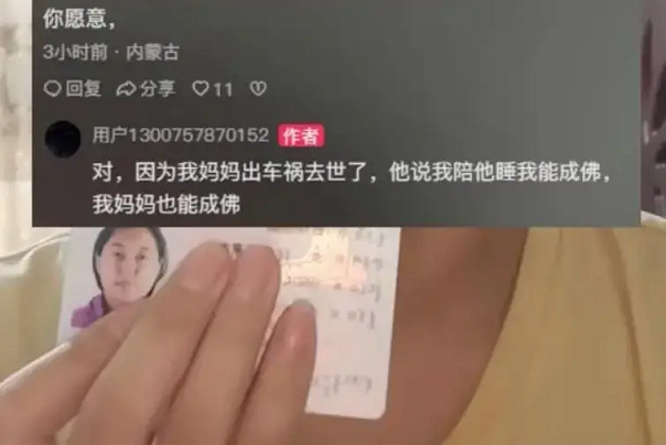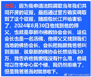 2024年6月: 近日,一名女子實名舉報寺廟住持的消息是,迅速引發網民圍觀。 該女子舉著自己的身份證拍攝視頻,實名舉報遼寧省阜新市彰武縣聖經寺的住持洛桑晉美尼瑪,俗名包長江。 該女子指責這個寺廟的住持在她19歲的時候通過欺騙的手段,騙她做地下情人,情人關系持續了4年時間,直至她23歲才結束。 女子稱在她19歲時母親因病離世,這讓她悲痛萬分,久久無法接受。迷茫之中她試圖在寺廟裡找到安慰,經常去聖經寺祈禱。 聖經寺住持包長江於是就注意到了她,注意到了她的無助、她的脆弱。包長江對當時心陷痛苦中的她進行欺騙,說她只要和他睡覺,她和她離世的母親就都能成佛,成為另外一個世界的贏家。 這個謊言,卻讓19歲的她深信不疑,於是她就成了聖經寺住持的情人。而且這個情人關系持續了4年之久。 女子聲稱,之後仍放不下悲傷的她去讀了佛學院,一讀就是10年。而隨著年齡的增長和知識的增多,她意識到聖經寺住持包長江的那些陪他睡覺就能成佛,是包長江在騙她。