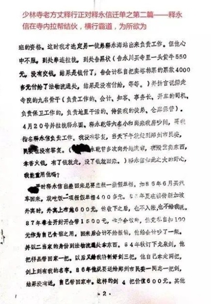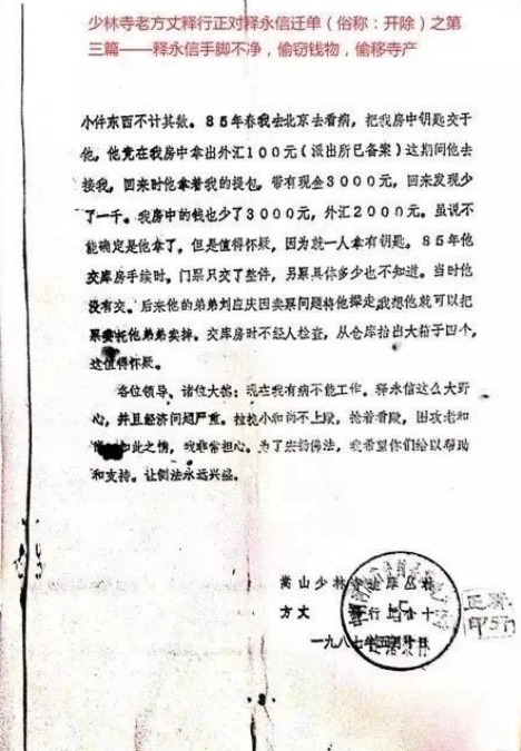 前言 16歲出家,21歲擔任少林寺管委會主任主持事務,34歲榮膺少林寺方丈。 看到釋永信的這份履歷,古往今來皆罕見,而在他之前的前一任方丈,釋永信的師父釋行正接任方丈時已經年72歲。 那麼釋永信為何會這麼年輕就接任少林方丈?他的這些“罕見”背後又有什麼原因? 少年入寺,嶄露頭角 1981年,年僅16歲的釋永信懷著對佛教的虔誠,來到了嵩山少林寺,拜在第二十九代方丈釋行正長老座下,開始了他的修行生涯。 那時的少林寺,雖然歷史悠久,底蘊深厚,卻面臨著諸多困境,寺廟的建築年久失修,僧眾的生活艱苦,宗教活動受到重重限,盡管如此,釋永信並沒有因環境的艱難而氣餒,反而更加堅定了自己修行的決心。 他每天隨師父和僧眾誦經、打坐、習武,專心鑽研佛法,不僅如此,他還主動參與寺院的各項事務,做得一絲不苟,得到了師兄弟們的認可和贊賞。 釋永信不僅對佛教經典有著濃厚的興趣,並且常常深入經堂,研讀佛教經典直至深夜,他還在修行中展現出了卓越的悟性,深入理解佛教教義,常能提出新穎的見解,這使得他在寺內逐漸嶄露頭角。 與此同時,釋永信也積極學習現代知識,拓寬自己的視野,為將來擔任寺院管理工作做了充分准備。 1986年,21歲的釋永信因為在寺院中的出色表現,被推選為少林寺管委會主任,開始全面主持寺院事務。這個年輕的僧人憑借自己的智慧和勇氣,開始為少林寺的未來鋪路。 作為管委會主任,釋永信面臨著寺院管理體制亟需改革、僧眾生活條件需要改善等種種難題,不過他並未被這些困難嚇倒。 與之相反,他深入了解僧眾需求,傾聽他們的意見與建議,對寺院管理體制進行了一系列改革,提升了管理的規範性與科學性。 同時,他積極爭取社會各界的支持,為寺院的修繕和發展籌集資金,改善了僧眾的生活條件,而命運卻在1987年悄然轉折。 就在釋永信滿懷希望地繼續推動寺院改革時,一場突如其來的風暴打破了寺院的平靜,1987年5月,釋行正長老臨終前的兩個月,寫信給中國佛教協會,提出對釋永信的質疑。  信中指出,釋永信存在諸多問題,認為他心懷野心,尚不具備接任方丈的資格,信中列舉了釋永信的一些行為:偷拿法卷,稱自己為方丈等,這些行為在佛教寺院中被視為極為嚴重的違規行為。