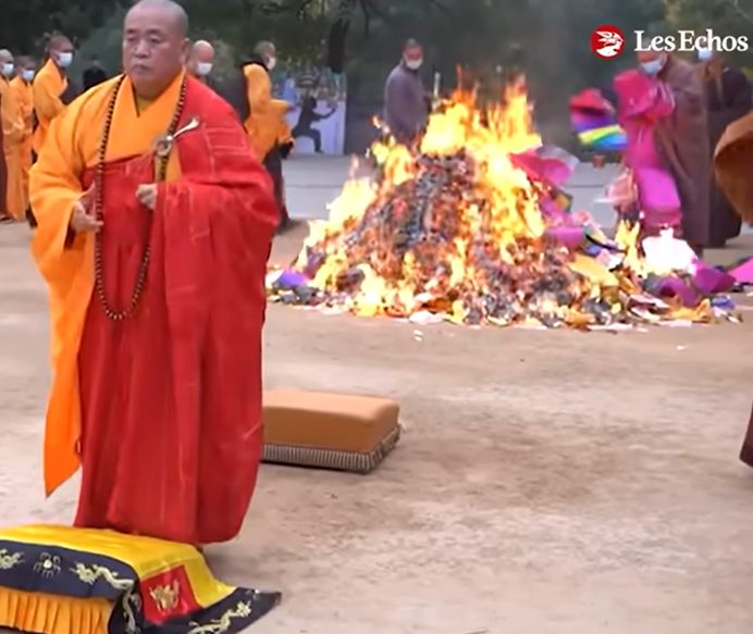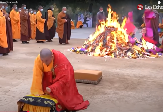 火供和焚燒五色旗是密宗儀式所必備,但是出現在少林寺的法會上。正統寺院裡只焚燒香、金紙折成的寶塔等。 直到少林寺方丈釋永信醜聞爆出來,回頭去看他曾經公開的客堂 、知客室,擺放著不少密宗的、假佛教的雕像,最明顯的就是五方佛。
