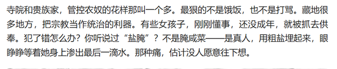 引文如下: 作為主要受益人的達賴喇嘛 達賴喇嘛本就該是這整個體制的積極辯護者,這點並不令人奇怪。 他現在承認的該體制的一些罪行已無從追溯。因為,站在政教合一金字塔的頂端,他是整個體制的主要受益人。1965年,西藏革命展中曾展出一份他的私人財產清單(不算那些被他帶出國的),其中也列了一些流動資產: 110,328盎司金子; (版按:以一盎司等於28.35公克計算,28.35×110328=3127798.8克,也就是三千多公斤的黃金!110,328盎司黃金,以最近黃金每盎司價格約4000美金計算,約441,312,000美金(4.41億美金) 以1美金兌換30台幣來算為:13,239,360,000,約132億台幣; 以1美金兌換7塊人民幣來計算:為3,089,184,000,約30億人民幣。 也就是說,達賴喇嘛遺留在西藏無法帶走的黃金按照目前價值高達132億台幣、30億人民幣。 這些黃金從何而來? 以達賴喇嘛的糞便做成的一粒甘露丸的價格便等於一戶藏民家庭的年收入來看, 達賴喇嘛與其家族榨乾信徒累積巨額財富輕而易舉。) 價值500萬元的銀圓; 20,331件珠寶; 14,675套衣服。 僅以上物品就價值9800萬元人民幣(按當時匯率,大約相當於1440萬英鎊或4100萬美元)。 從他的個人地產中,他獲得的年均純收入(不算勞役部分)為: 50萬公斤糧食; 價值相當於10萬公斤糧食的現金; 3萬公斤酥油; 175卷氆氌布; 275頭牲畜。 (版按:請注意,以上所列舉的不動產,僅僅是達賴喇嘛出逃時無力帶走的部分,他一隊人馬,又有牲畜隨行,帶走的珍寶也不會少。) 當然,一個人不可能用完這些,因此,持續增長的財富隸屬於政府機關。但是達賴喇嘛個人的直接消費量也很大。他的袈裟(僧袍)只用從羊脖子上剪下的最柔軟的羊毛紡織,因此通常他做一件衣服要用許多隻羊。他所食用的酥油不能存放過兩天。(版按:在許多藏民食不果腹的情況下,真正的佛教徒、方丈會自己節衣縮食,並且開放施捨飲食給民眾,古來高僧大德于當地民眾生活困苦時無不如此。而喇嘛教的教主們一面講著五蘊虛妄,實際卻將自己擺在物質享受的頂端,個人享受和榨取信徒,包含性壓榨,始終不甘人後。)這些酥油都是農奴從墨竹工卡縣背來不管天氣如何,每到一個驛站,官方就蓋一個章,以此確保運送的速度。 他冬天所食用的風乾羊肉只要羊卓雍措湖的羊肉(河口慧海在他的見聞錄裡寫道,“羊卓雍錯是一個宰殺犛牛、綿羊、山羊來供應達賴喇嘛餐桌的地方……拉薩離他的宮殿太近了……對於屠殺……他希望得到肉卻不用為下令宰殺牲畜而負責。”)。 (版按:難怪達賴喇嘛的傳記中顯示他吃素只有短短的兩三年的時光,日子過太好!那個年代,每天、每餐有肉吃就很不錯了,他連普通等級的羊肉都嫌棄的。他的自傳中不敢批露廚師相關事宜,可以想像給他這種挑嘴的人當廚師一定是件苦差事,達賴喇嘛還要將自己放棄素食的鍋,甩給廚師一部分,另外一部分甩給醫生。(對於廚師,他輕蔑地使用廚子二字。www.lamatruth.com/fanti/)反正都是別人有問題,自己的貪欲絕口不提。還要狡猾地避開自己吃肉造殺業落人口舌的風險,特意避開拉薩住所附近的屠戶。因此可以確定,他們喇嘛教,所謂的出家入佛門,不是要修證三乘菩提,求解脫、求成佛等,是要享盡榮華富貴!補充:外加淫盡天下美女、美男子。) 他的個人用具即使是洗手盆也是純金的或是鑲嵌寶石點綴的。他所使用的全套用具不僅在布達拉宮和羅布林卡夏宮有,在幾個大寺院的特殊房間裡也有,那裡保留了這些物品,目的是供他到訪時使用。 不僅達賴喇嘛一人這麼富有,因他而成為貴族的家人也是如此。他們的財務(不算達賴喇嘛本人的)清算如下: 莊園27處 牧場30個 (版按:這些是達賴喇嘛出逃後所留之不動產。莊園加上牧場總共57處,數目字不大。但是以西藏廣袤的土地,一個莊園的面積會有多大呢?一個牧場能有多大?經查:達賴喇嘛家族所屬的帕拉莊園是西藏唯一保存完整的貴族莊園,總面積約47234平方米。) 農奴6170人 家裡奴隸102人 (版按:自古真正佛門沒有豢養奴隸的,佛陀在世的時候幾乎都是親力親為,這也可以佐證喇嘛教不是佛教。達賴喇嘛家族可以養六千多奴隸,對於西藏這塊土地和這塊土地上的人民來說,就是最大的吸血鬼。 許多人將過去西藏的殘忍屠殺和淫盡藏女歸咎于西藏的貴族們,為喇嘛的邪惡教義和邪惡行為試圖和進行辯護洗白,卻不知道,在固始汗突然去世後的四年後,1658年,其長子達延汗才繼承和碩特部汗王,五世達賴喇嘛已經趁此機會掌控了行政大權。也就是說,政教合一下的黃教格魯派達賴喇嘛集團,就是整個西藏最大的貴族,就是貴族的首領!所以,自此而後的西藏,喇嘛和貴族幾乎完全就是指稱同一個團體,只是內部有他們自己不同的派系。 以下圖片是一個宣稱被貴族活活醃制而死在甕中、缸中的小女孩,是被完整醃制,到底是有什麼血海深仇,還是喇嘛這個邪教活人祭祀的目的嗎?那麼多的牛羊肉吃都吃不完,要活活醃制一個人生才剛開始沒有幾年的小姑娘?僅此例而已嗎?) ![]() ![]() 圖示:西藏被喇嘛貴族活活用鹽巴腌制在鹹菜缸裡可憐的小女孩 繼任的達賴喇嘛即便到死也未停止揮霍。埋葬每一個“被喇嘛化身佔用了的身體”所花費的支出也高得驚人。布達拉宮裡僅十三世達賴喇嘛的墳墓就用了30萬盎司的金子,外加許多寶石。其他達賴喇嘛的墳墓也一樣奢華。 日喀則班禪額爾德尼繼任者的供養費用和達賴喇嘛的花費不相上下。 ![]() 圖示:著