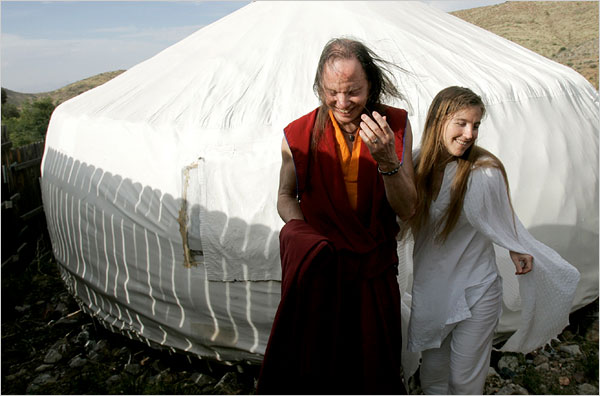 Published: The New York Times, May 15, 2008 By LESLIE KAUFMAN ![]() Michael Roach and Christie McNally vowed to be both celibate and never apart by more than 15 feet or so. (David Sanders for The New York Times) ![]() They live in a yurt in Arizona that is equipped with a wood-burning stove, but no electricity or running water. (David Sanders for The New York Times) TEN years ago, Michael Roach and Christie McNally, Buddhist teachers with a growing following in the United States and abroad, took vows never to separate, night or day. By “never part,” they did not mean only their hearts or spirits. They meant their bodies as well. And they gave themselves a range of about 15 feet. If they cannot be seated near each other on a plane, they do not get on. When she uses an airport restroom, he stands outside the door. And when they are here at home in their yurt in the Arizona desert, which has neither running water nor electricity, and he is inspired by an idea in the middle of the night, she rises from their bed and follows him to their office 100 yards down the road, so he can work. Their partnership, they say, is celibate. It is, as they describe it, a high level of Buddhist practice that involves confronting their own imperfections and thereby learning to better serve the world. “It forces you to deal with your own emotions so you can’t say, ‘I’ll take a break,’ ” said Mr. Roach, 55, who trained in the same Tibetan Buddhist tradition as the Dalai Lama. After becoming a monk in 1983, he trained on-and-off in a Buddhist monastery for 20 years, and is one of a handful of Westerners who has earned the title of geshe, the rough equivalent of a religious doctorate. “You are in each other’s faces 24 hours a day,” he said. “You must deal with your anger or your jealousy.” Ms. McNally said, “From a Buddhist perspective, it purifies your own mind.” Ms. McNally is 35 and uses the title of Lama, or teacher, an honor not traditionally bestowed on women by the Tibetan orders. Their exacting commitment to this ideal of spiritual partnership has been an inspiration to many. In China and Israel, and in the United States, where they are often surrounded by devotees, their lectures on how laypeople can build spiritual partnerships are often packed with people seeking mates or ways to deepen their marriages. They hope their recently published book, “The Eastern Path to Heaven,” will appeal to Christians and broaden their American audience. But their practice — which even they admit is radical by the standards of the religious community whose ideas they aim to further — has sent shock waves through the Tibetan Buddhist community as far as the Dalai Lama himself, whose office indicated its disapproval of the living arrangement by rebuffing Mr. Roach’s attempt to teach at Dharamsala, India, in 2006. (In a letter, the office said his “unconventional behavior does not accord with His Holiness’s teachings and practices.”) “There is a tremendous amount of opprobrium by the Tibetan monks; they think they have gone wacky,” said Robert Thurman, a professor of Indo-Tibetan Buddhism at Columbia University. Professor Thurman, a former monk himself, describes himself as a friend and admirer of Mr. Roach, and said that after the geshe made his relationship with Ms. McNally public in 2003, he begged him to renounce his monastic vows and to stop wearing the robes that mark him as a member of a monastic order. Mr. Roach declined, and the two have not spoken since. “He is doing this partnership thing and insisting on being a monk,” Professor Thurman said. “It is superhuman. He says he is staying celibate, but people find it hard to believe.” The yurt in which Mr. Roach and Ms. McNally live when they are not traveling the world (which is often about half the year) sits in the high desert some 100 miles east of Tucson, on a platform overlooking a rift in the cactus-speckled hills. For 100 acres around, the land is the property of Diamond Mountain University, an unaccredited school that Mr. Roach founded with Ms. McNally in 2004 to teach Buddhist principles and translation skills. Although devoid of modern conveniences, the yurt they live in, which is 22 feet in diameter, feels almost luxurious compared with the spare, desiccated landscape around it. On one side of the tent is their double bed, and beside it a commode elegantly disguised as a wood side table. The floor is covered with carpets. A few carved wooden chests hold clothes and pillows. Light streams in from a hole at the center of the tent’s roof, illuminating its poles, which were imported from Mongolia. The closeness to nature means that the indoor temperature is essentially the ambient one — beyond baking in the summer and freezing in the winter. (Their one attempt to battle the elements is a wood-burning stove.) The couple did a three-year silent retreat in this yurt from 2000 to 2003, while their relationship was a secret to all but the few people who brought them food. Soon afterward, Mr. Roach determined it should be public, even if it flew in the face of two millenniums of Tibetan Buddhist tradition. He acted for two reasons, he said. One, he felt that it was impossible to keep secrets in this age of Google Earth. Two, he decided that if Buddhism was really going to succeed in America, it would have to be more inclusive of women. “If these ideas that will help people are going to make it in the West,” Ms. McNally said, “it can’t be a male-dominated culture, because people are not going to accept that.” Ms. McNally’s path from student to co-teacher and constant partner has been a hard one, they both say. When she met Mr. Roach in 1996, two years out of New York University, where she majored in literature, he was a learned Buddhist. Two decades her senior, he was a Princeton graduate who in his years studying for the geshe degree also built a personal fortune by helping to grow Andin Interna